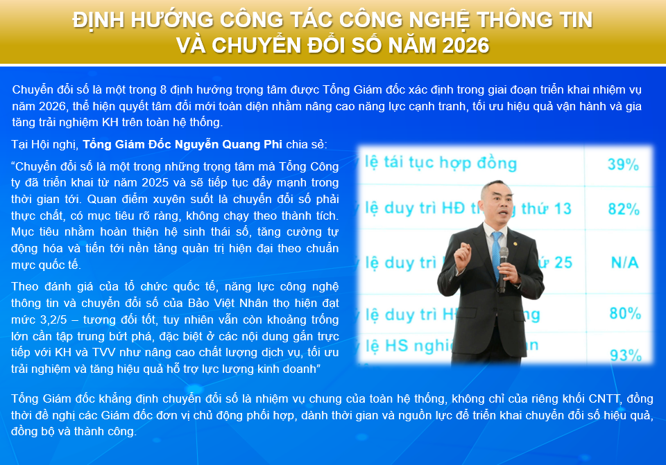 Khép lại nội dung vinh danh và định hướng chuyển đổi số tại Hội nghị Triển khai nhiệm vụ năm 2026, đây không chỉ là sự ghi nhận cho những nỗ lực tiên phong của các đơn vị trong chuyển đổi số năm 2025, mà còn là lời hiệu triệu để toàn hệ thống cùng bước vào năm 2026 với tinh thần quyết liệt hơn, hành động nhanh hơn, đồng lòng hơn. Mỗi sáng kiến được triển khai, mỗi thói quen số được hình thành hôm nay sẽ góp phần tạo nên sức bật mới cho Bảo Việt Nhân thọ trên hành trình nâng tầm trải nghiệm khách hàng, tăng hiệu quả vận hành và bứt phá năng lực cạnh tranh — sẵn sàng cho giai đoạn phát triển mạnh mẽ tiếp theo.