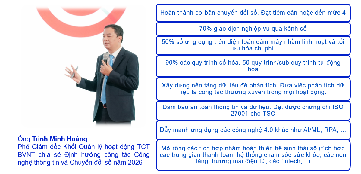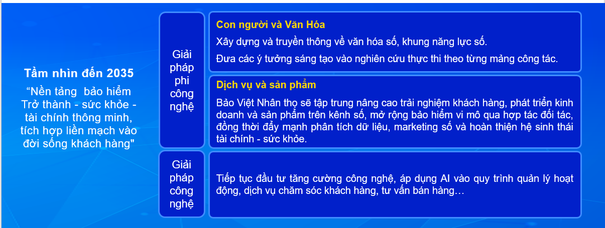 Với tầm nhìn đến năm 2035 “Trở thành nền tảng bảo hiểm – sức khỏe – tài chính thông minh, tích hợp liền mạch vào đời sống khách hàng”, Bảo Việt Nhân thọ tiếp tục triển khai đồng thời các nhóm giải pháp phi công nghệ và công nghệ, tập trung vào phát triển văn hóa số, nâng cao năng lực đội ngũ, đổi mới dịch vụ – sản phẩm, cùng với việc tăng cường đầu tư hạ tầng và đẩy mạnh ứng dụng các công nghệ hiện đại. Song song đó, các mục tiêu cụ thể giai đoạn 2026–2030 được xác định rõ ràng nhằm tạo nền tảng vững chắc cho hành trình chuyển đổi số toàn diện của toàn hệ thống.