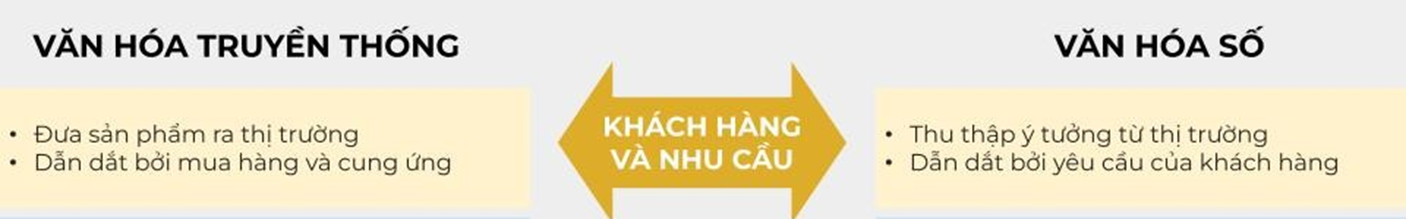 Theo báo cáo của Strategy& (PwC), sự khác biệt giữa văn hóa truyền thống và văn hóa số thể hiện qua ba khía cạnh: cách doanh nghiệp thấu hiểu khách hàng, cách tổ chức bộ máy và phương thức làm việc trong nội bộ.