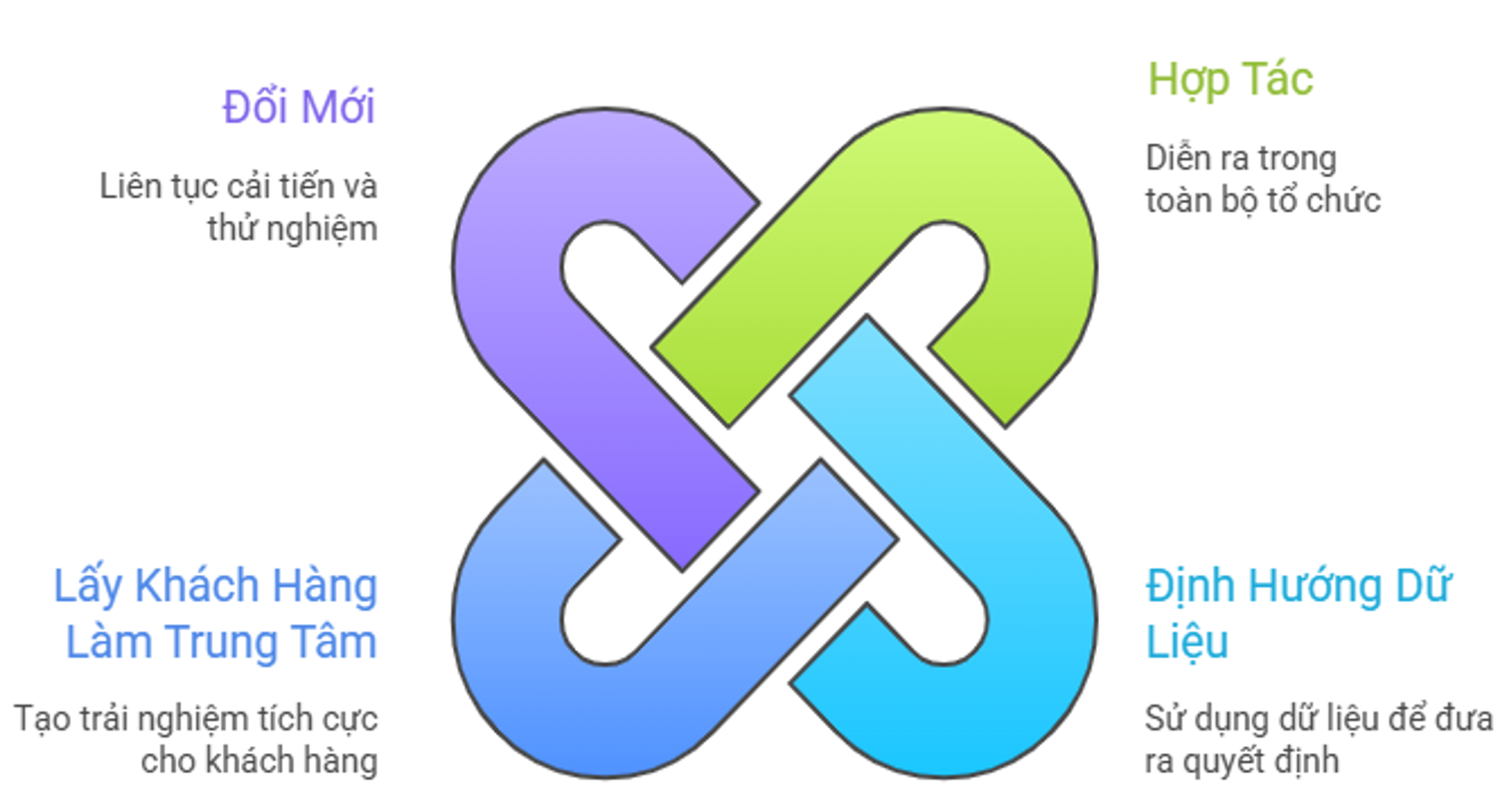 - Lấy khách hàng làm trung tâm: tập trung tạo ra trải nghiệm tích cực cho khách hàng thông qua sản phẩm, dịch vụ và quy trình phục vụ.
